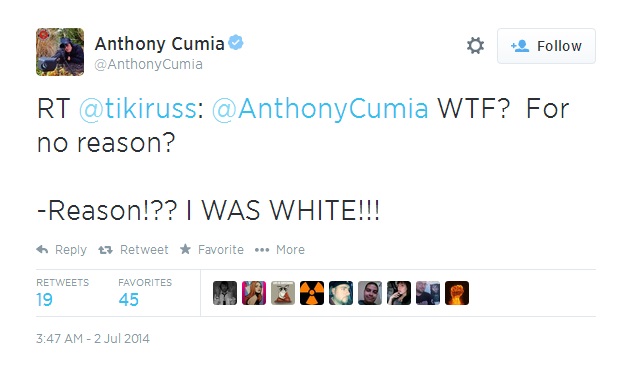 As other users asked whether he was going to press charges, Cumia replied: “No! It doesn’t work! White guy/Black ‘girl’. We’re doomed!”